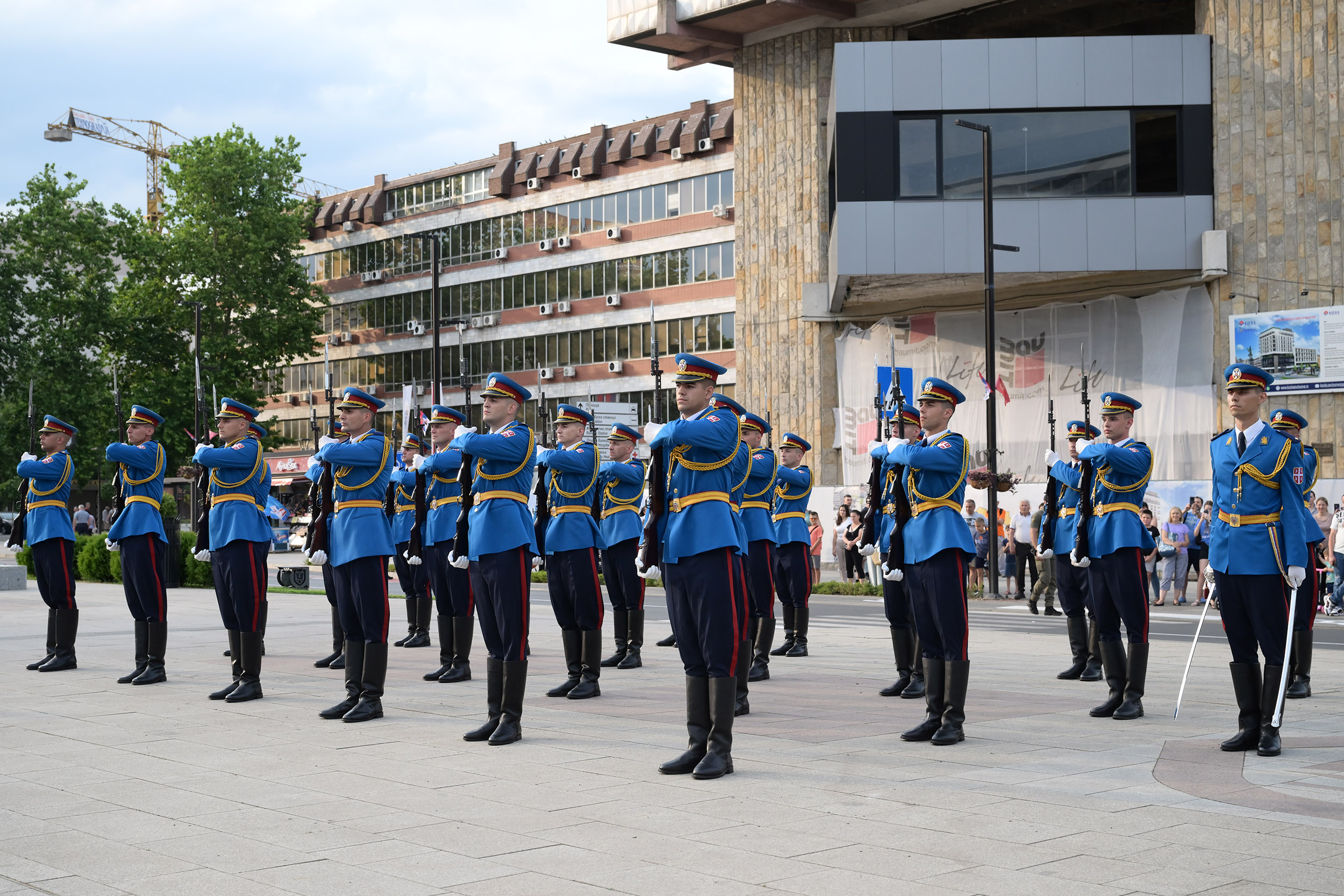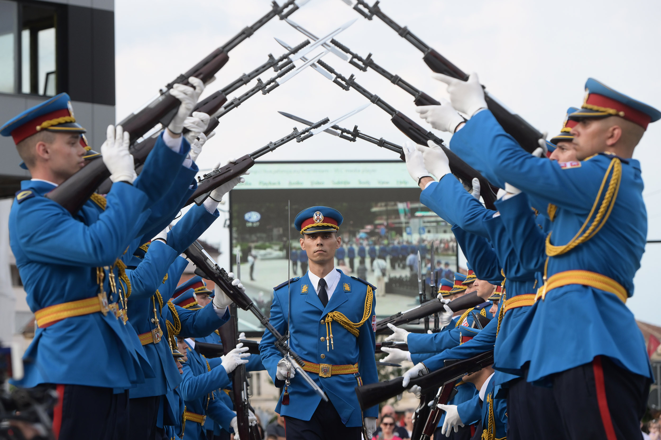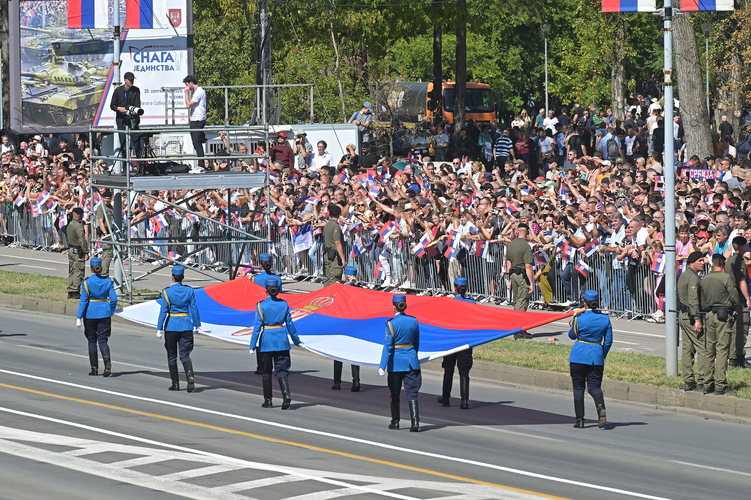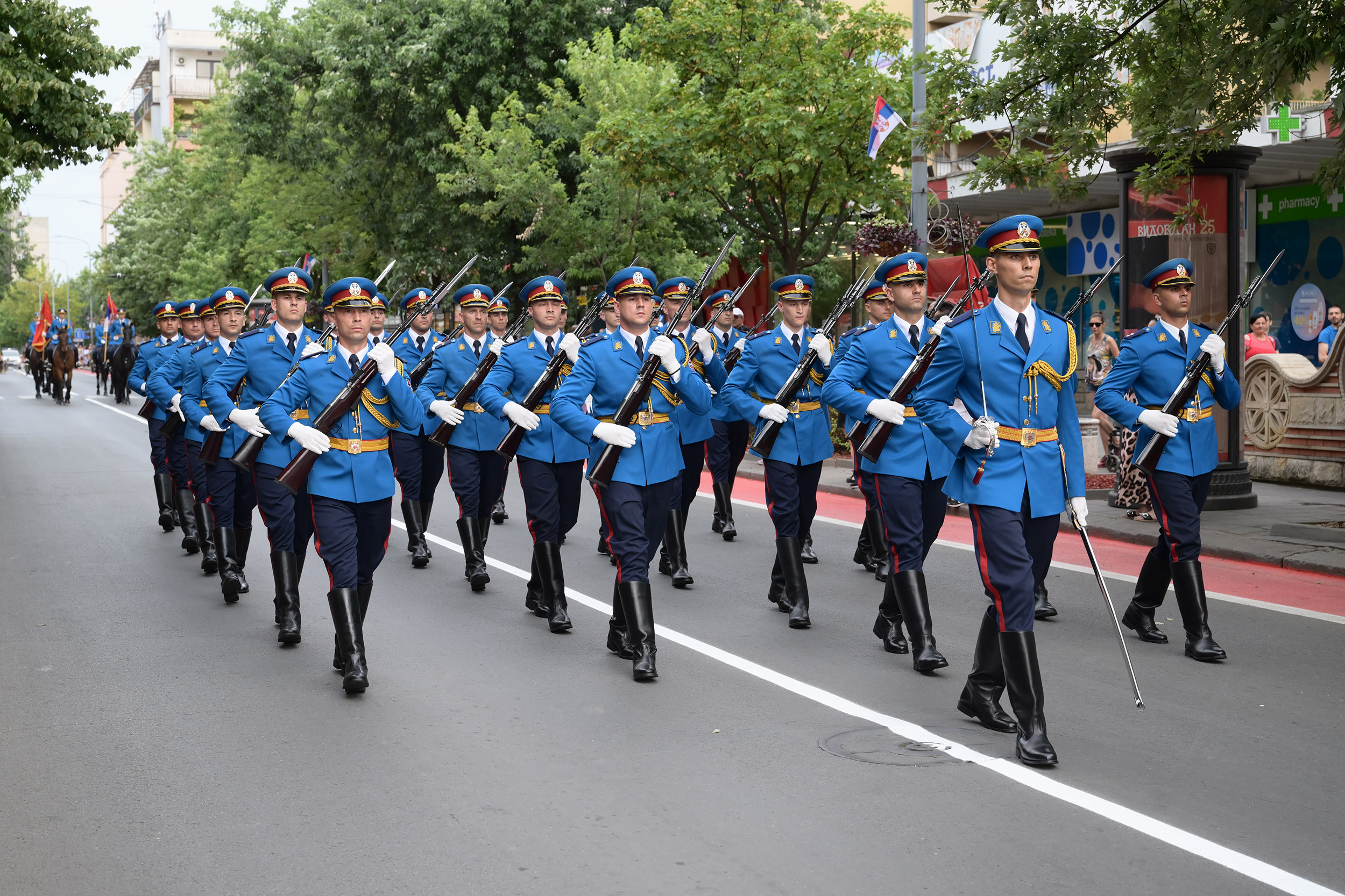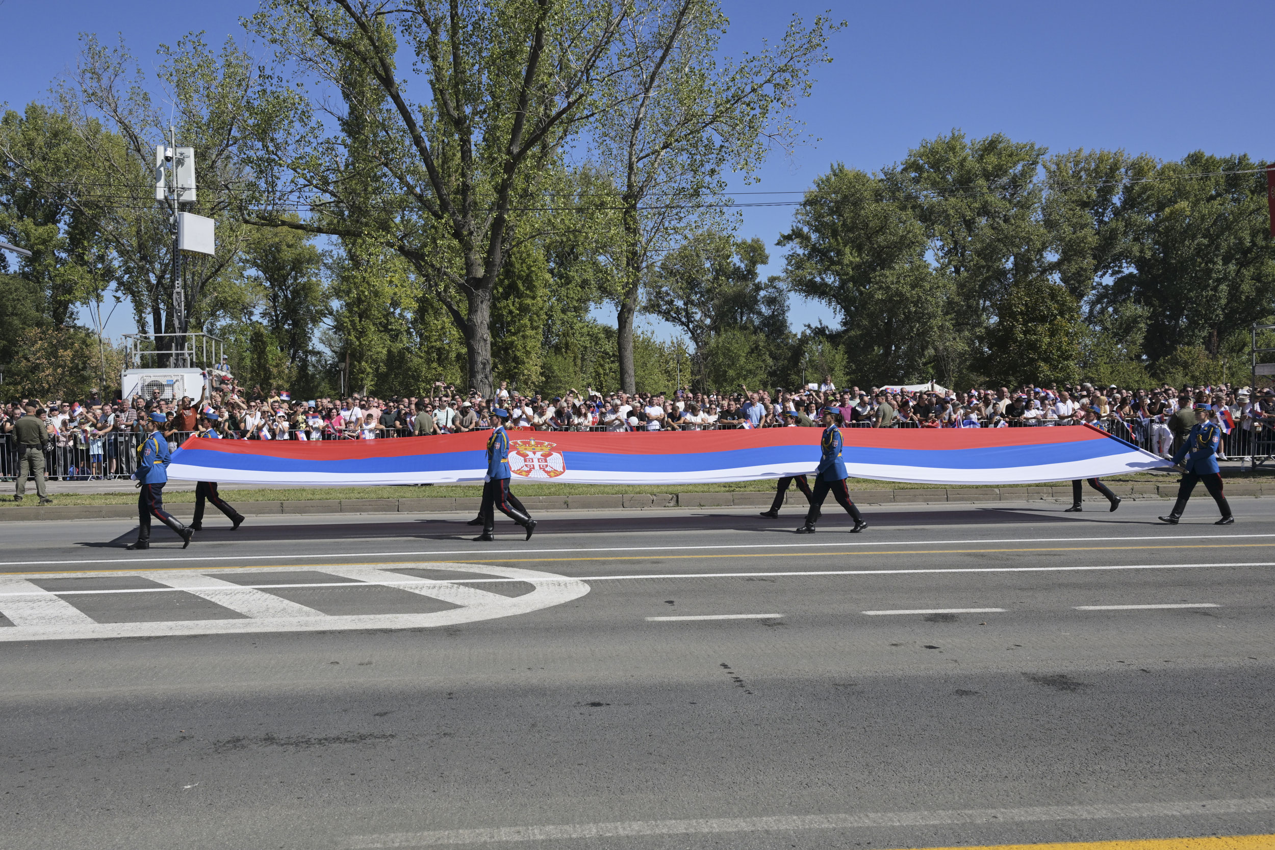 На војној паради „Снага јединства” у Београду припадници егзерцира изводе стројеве радње уз две композиције из Сплета српских родољубивих песама: „Ој, Србијо, мила мати” и „Тамо далеко”.