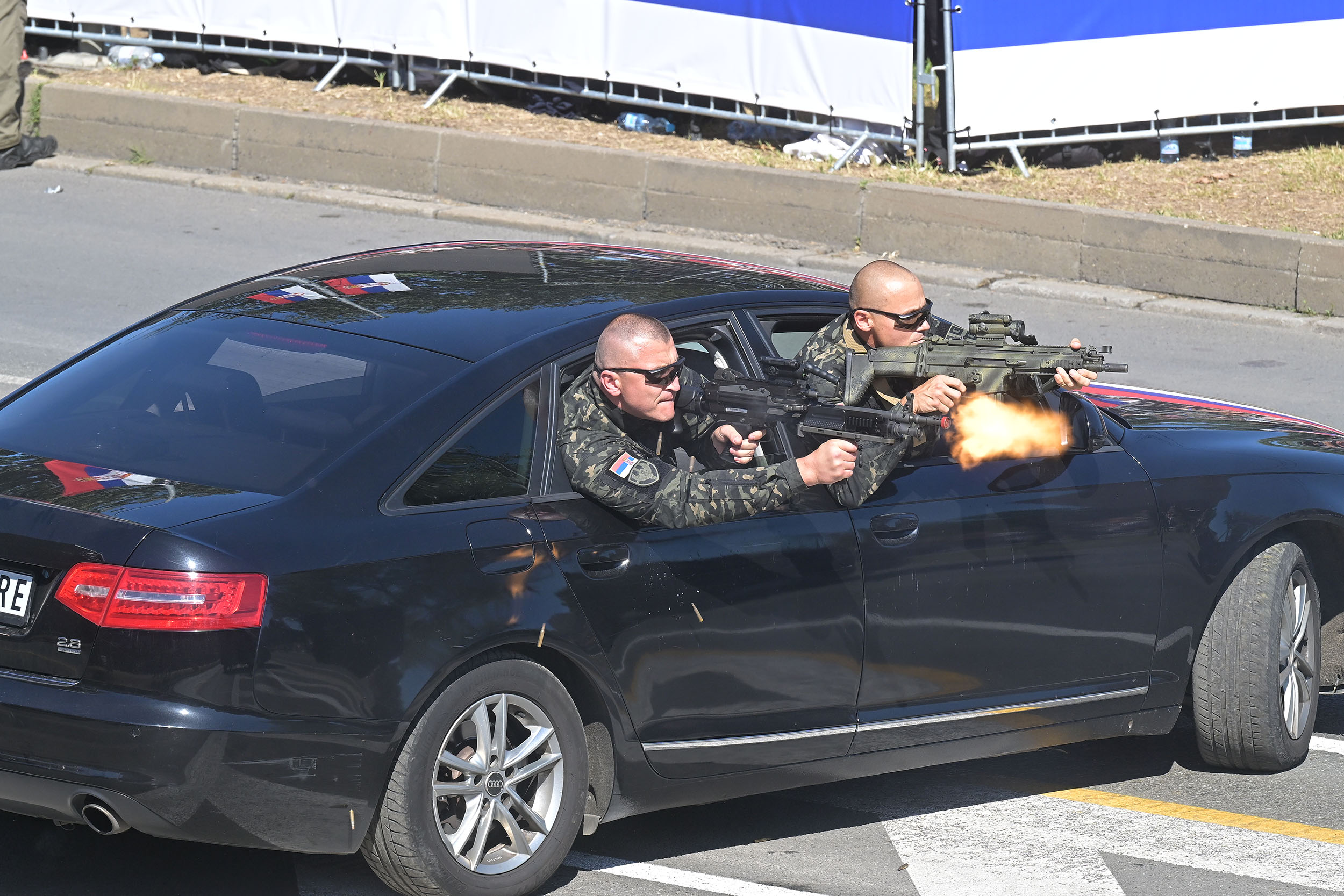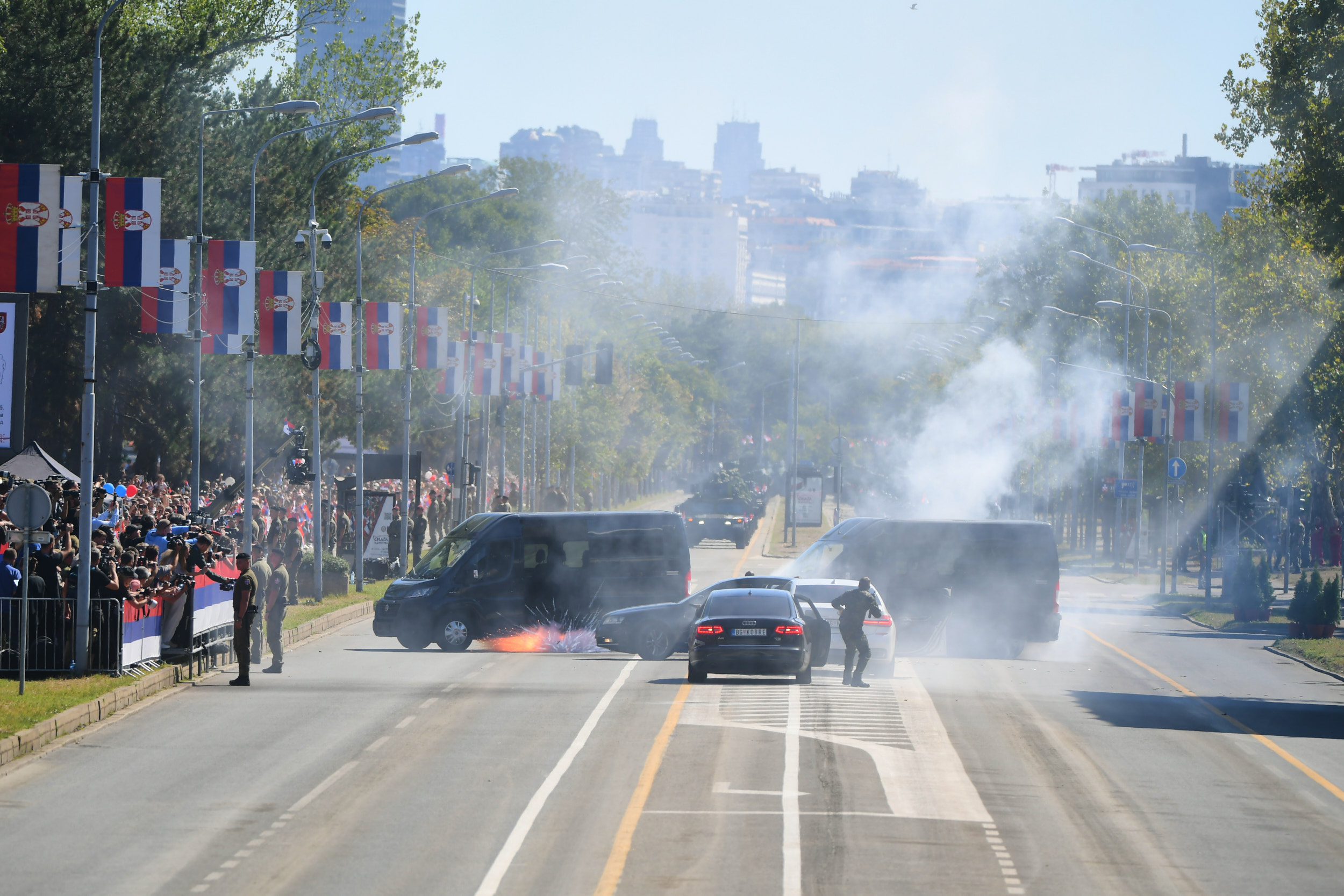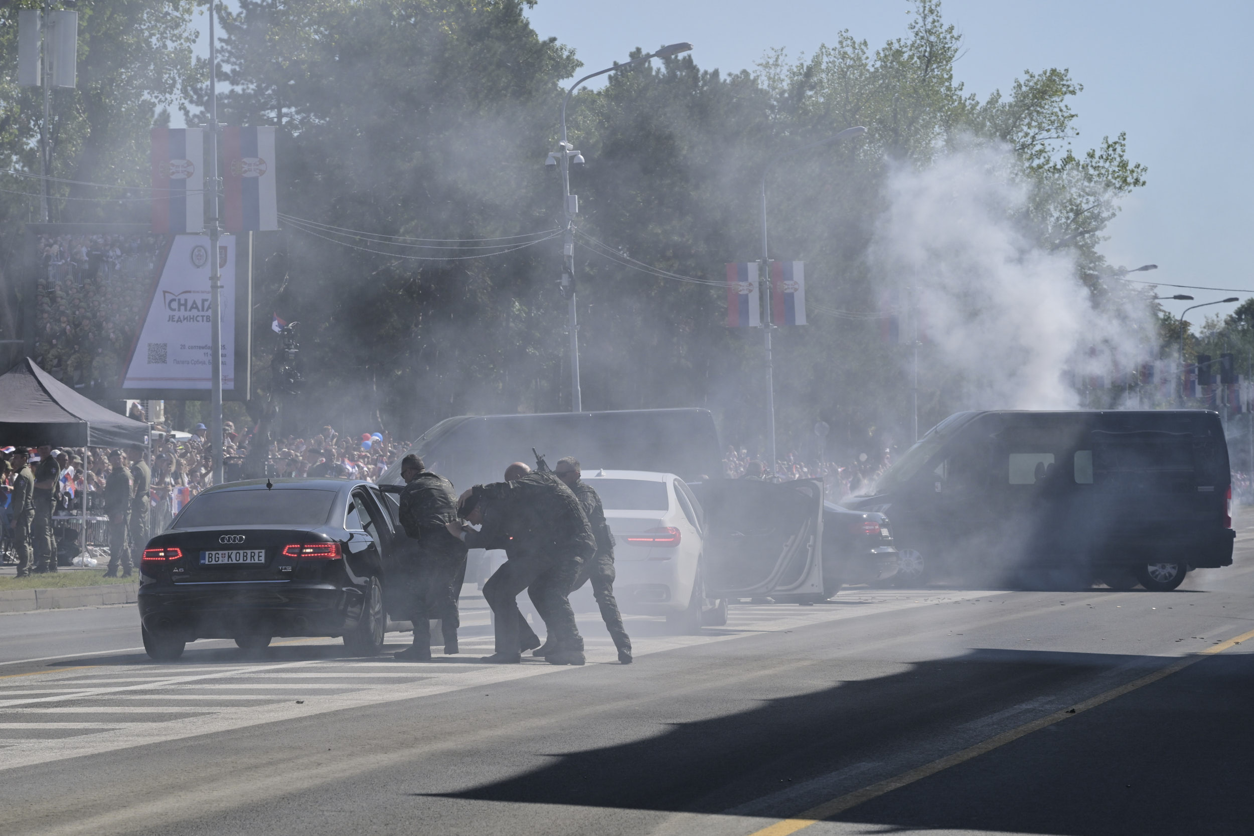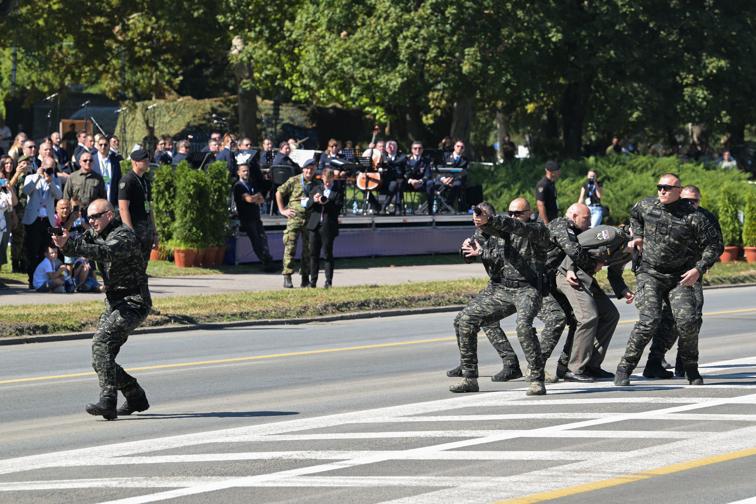 Припадници Одреда војне полиције специјалне намене „Кобре” на војној паради „Снага јединства” изводе приказ обезбеђења одређене личности на јавном скупу.