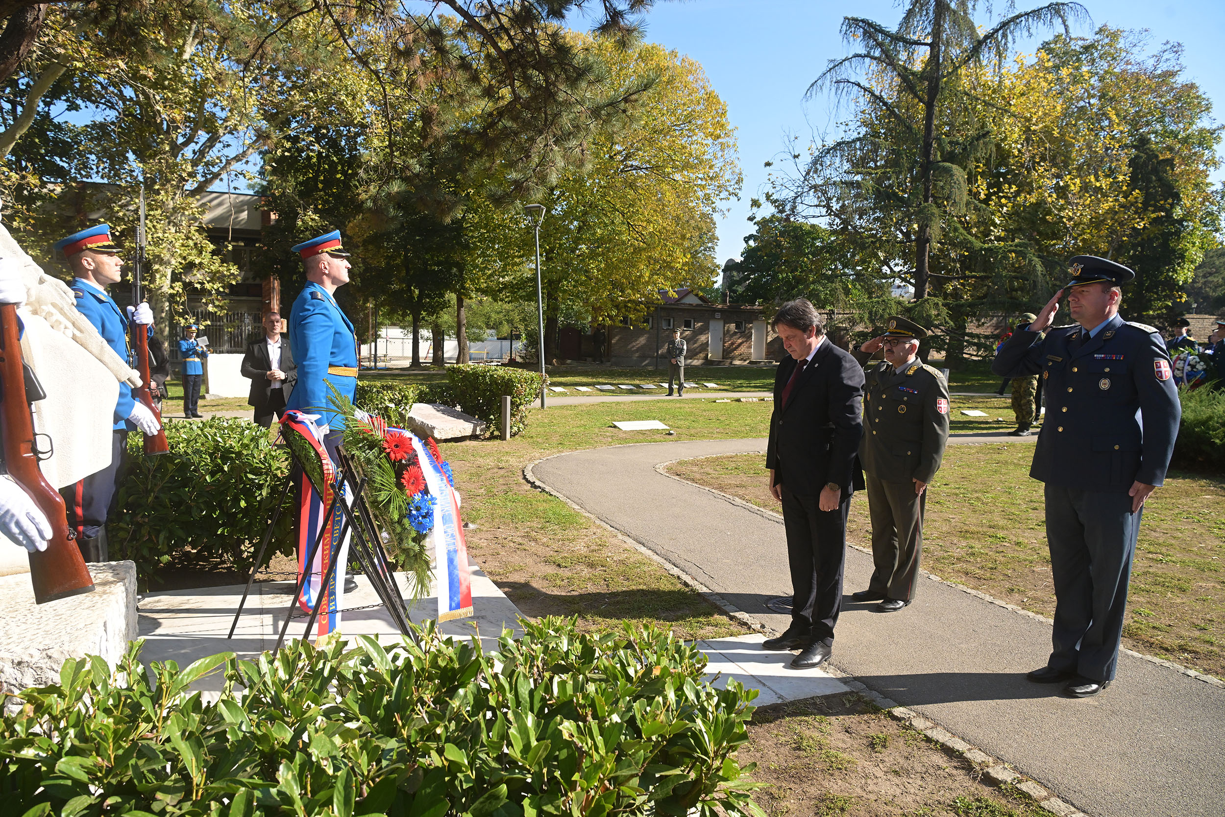 Том приликом министар одбране, у пратњи бригадног генерала проф. др Бобана Ђоровића и пуковника Николе Матовића, положио је венац на спомен обележје Ослободиоцима Београда.