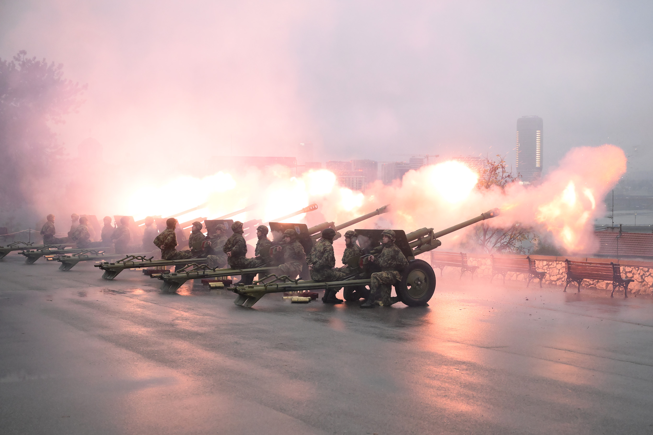 Поводом обележавања Дана примирја у Првом светском рату, у складу с наређењем председника Републике и врховног команданта Војске Србије Александра Вучића, припадници Гарде Војске Србије извели су данас почасну артиљеријску паљбу испаљивањем 10 плотуна из шест артиљеријских оруђа са Савске терасе на Калемегдану.