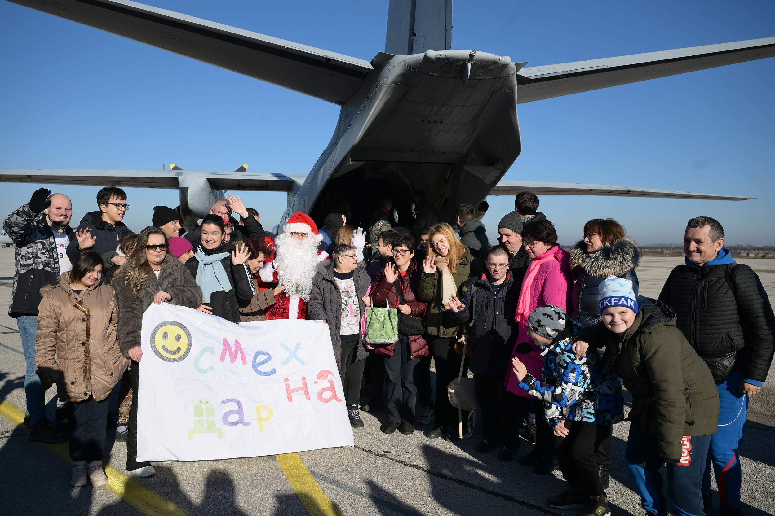 Штићеници Удружења за помоћ особама са сметњама у развоју „Живимо заједно“ и хуманитарне организације „In help“ из Београда те малишани из Основне школе за образовање ученика са сметњама у развоју „Сава Јовановић Сирогојно“ из Добановаца, са осмесима на лицима дочекали су Деда Мраза и Добре Виле. Били су у прилици и да уђу у авион Војске Србије и друже се са посадом.
