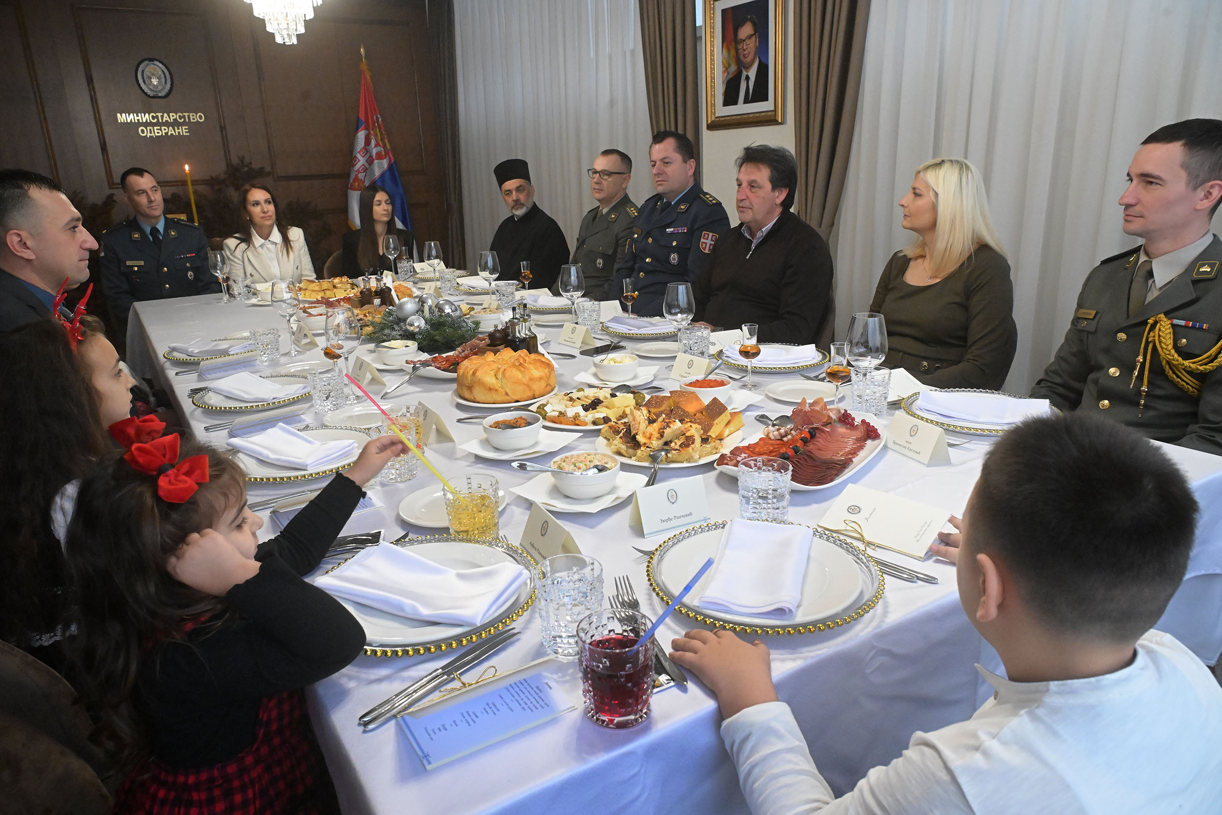 Министар одбране Братислав Гашић приредио је данас у Министарству одбране божићну трпезу за седмочлану породицу припадника Војске Србије млађег водника Јована Раичевића.