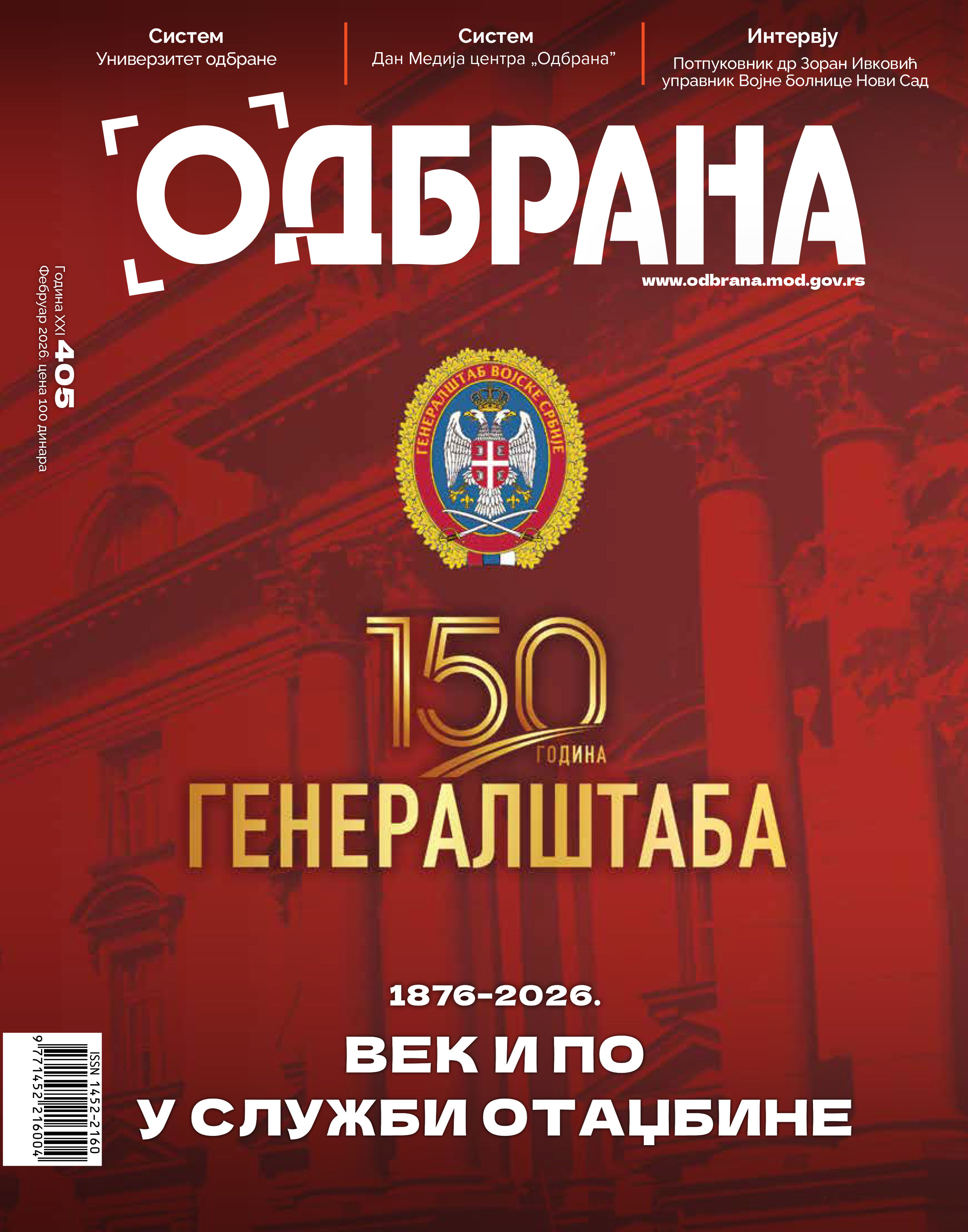 Фебруарски број „Одбране” посвећен је великом јубилеју – 150 година од формирања Генералштаба српске војске – највишег стручног и штабног органа за припрему и употребу Војске у миру, ванредном и ратном стању. Текст у рубрици Стајна тачка говори о његовом непрекидном развоју и унапређењу.