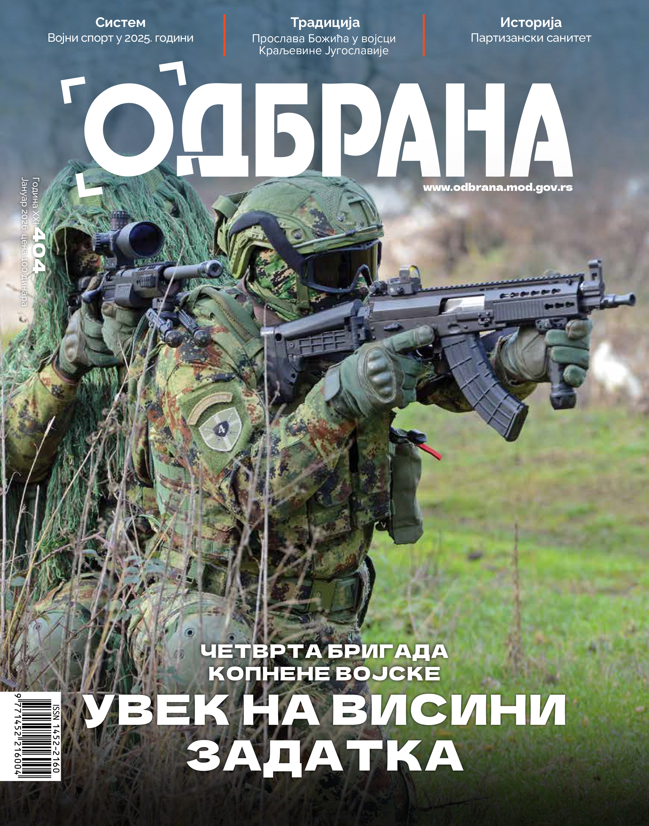 U novogodišnjem broju magazina „Odbrana” pročitajte zanimljive reportaže i aktuelne vesti iz sistema odbrane. Rubriku „Stajna tačka” posvetili smo jedinici koja u ovom mesecu obeležava svoj dan – Četvrtoj brigadi kopnene vojske.